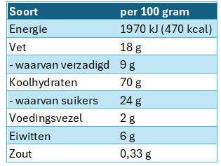 Ingrediënten: TARWEbloem, margarine (palm vet, water, koolzaadolie, emulgator: mono- en diglyceriden uit vetzuren, voedingszuur: citroenzuur), suiker, EI, afgeroomde MELKpoeder, honing, rijstzetmeel, rijstbloem, suikersiroop, TARWEzetmeel, kandijstroop, natuurlijk vanille-extract, rijsmiddel (natriumbicarbonaat, ammoniumbicarbonaat), zout Kan ook sporen van noten, soja en sesam bevatten. Voor allergenen onder andere granen met gluten, zie ingrediënten in het HOOFDLETTERS gedrukt.